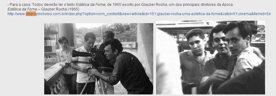 Em seus filmes, essa “estética da fome” se concretiza em uma representação metafórica da História. Por meio da violência, as personagens de Glauber Rocha mostram o irracionalismo e as forças inconscientes reprimidas pela razão, tentando assim abrir uma via para a revolução. Em um artigo de 1971, “Estética do sonho”, ele define a revolução como “a ‘anti-razão’ que comunica as tensões do mais irracional de todos os fenômenos, a pobreza”.