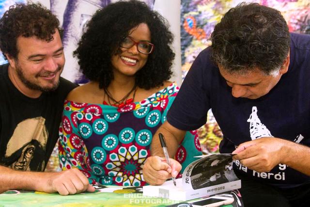 Tomaz André (editor do Zineoficial e sócio-produtor dos livro) com sua namorada Maria Helena e o autor. Ou troco uma cerveja sem por duas com álcool.